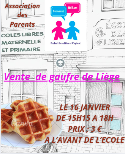 Ce vendredi 16 janvier à la sortie de l'école et jusqu'à 18h, l'AP s'installe sous une tonnelle à la sortie de l'école afin de vous proposer une gaufre de Liège cuite à la minute au prix de 3€ .